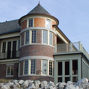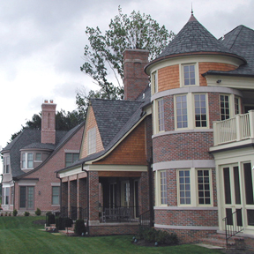 The lake façade has a sweeping roof line with a central gable balanced by a shingle clad tower.