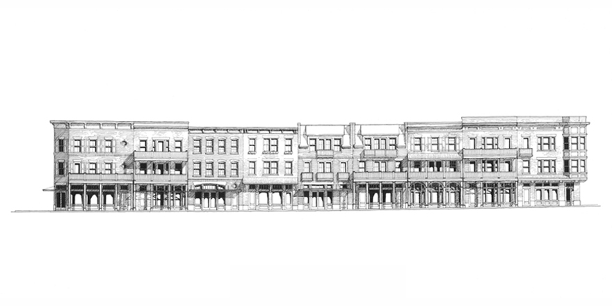 TOWN CENTER This street elevation for the Bayfront Boulevard Live-Work show's the potential massing options which include one and two story galleries or shop front awnings. This street is intended to be smaller shops and offices with loft style residences on the upper floors. |