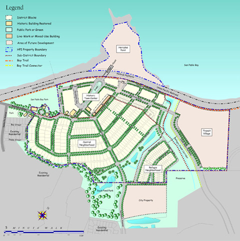 HERCULES WATERFRONT DISTRICT The Site Plan shows the location of the four main districts. The passenger rail line is located between the town center and the Point following San Pablo Bay's shoreline to Oakland. With town plan by Sargent Town Planning and Opticos Design, master plan by Dover Kohl.
