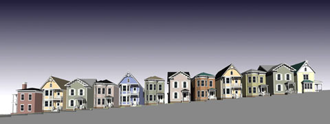 WATERFRONT NEIGHBORHOODThe streetscape vignette shows the development of the narrow lot houses along the sloping street. All corners were required to have a Siderow type house.