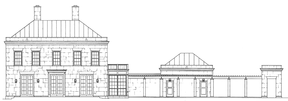 Residence in New Albany, Ohio This interpretation of a traditional American Country House references stone Federal homes built in Northern Ohio in the early to mid 1800's. Here, however, formal symmetries of the Federal Style are challenged and strict axial relationships are re-centered in order to address the complexities of the program and varying conditions of the site. The result is an assembly of pavilions connected by garden walls fronting the entry while enclosing the space beyond. |
