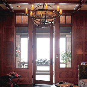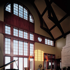 A series of axial spaces from the motor court through to the great hall organize this house to set up a visual connection to the lake