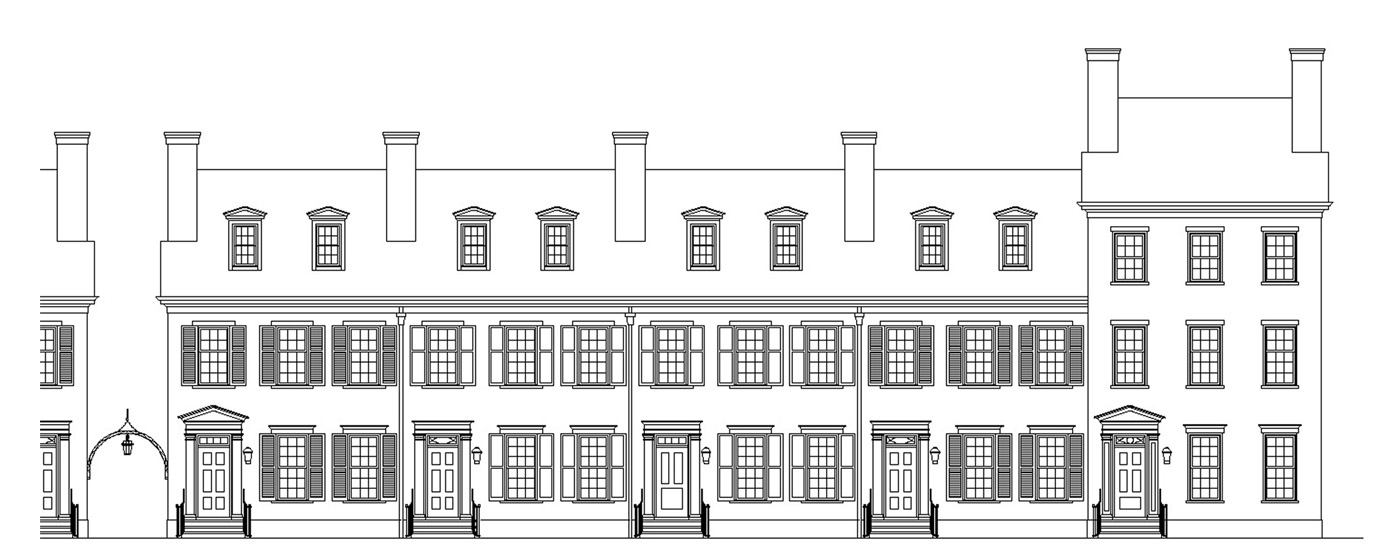 This street of townhouse units fronts onto the educational campus of Celebration. The three story end units mark intersections with the uniform two and half story middle units defining the street. Site Plan by Cooper Robertson and Robert A.M. Stern with Pattern Book by Urban Design Associates.