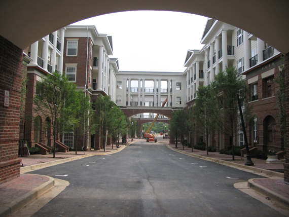 This apartment complex on a former commercial site within Kentlands is comprised of ten connected buildings organized by a series of streets and courtyards surrounding a six story parking garage. With The Preston Partnership and Master Plan by DPZ.