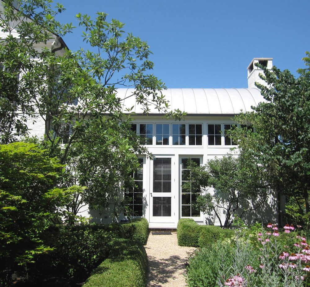 A distinctive barrel vaulted family room off the rear mass of the masonry structure helps to form and act as a backdrop to two distinct exterior spaces. A paved terrace off the central hall and formal living room on the north side accentuates the more informal garden flanked by the garage and garden shed extending to the south.