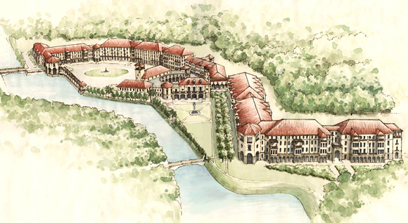 A study for a 258 unit Congregate Care Residential Community in Celebration, Florida contains independent living apartments and assisted living units. Public spaces include an arrival court, and a formal garden overlooking the canal with views to downtown. With Reese, Lower, Patrick & Scott.