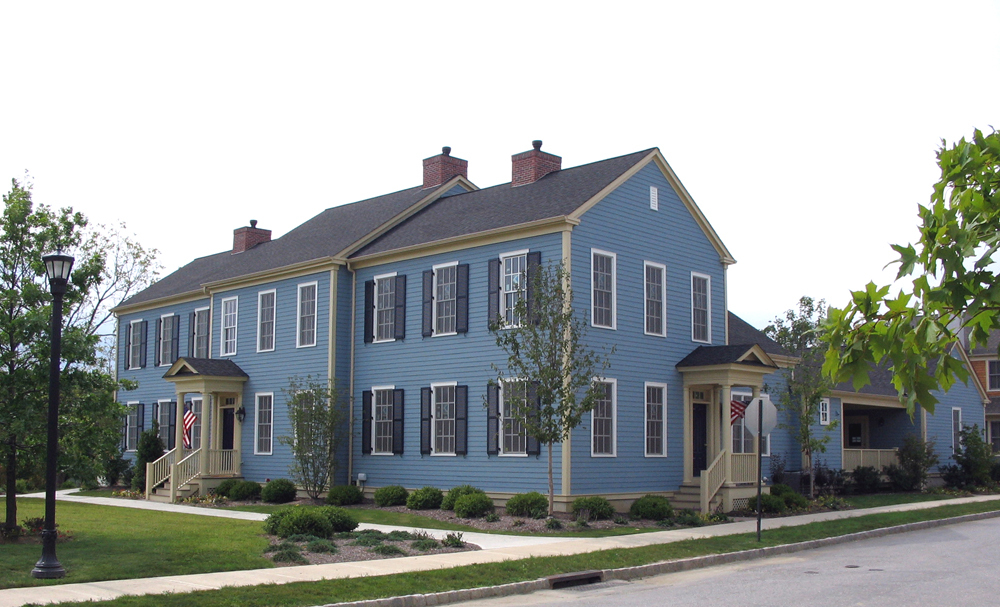 These ten unit, elevator served buildings are scaled to be compatible with the surrounding community of single family homes and townhouses. Within each ten unit building the masses are arranged in a "U" shape creating a mews arrival court at the rear with one garage per unit. The townhouse buildings incorporate two units with ground floor master bedrooms and two middle units with second floor master bedrooms. The character of the community draws on the local Dutch colonial traditions. |